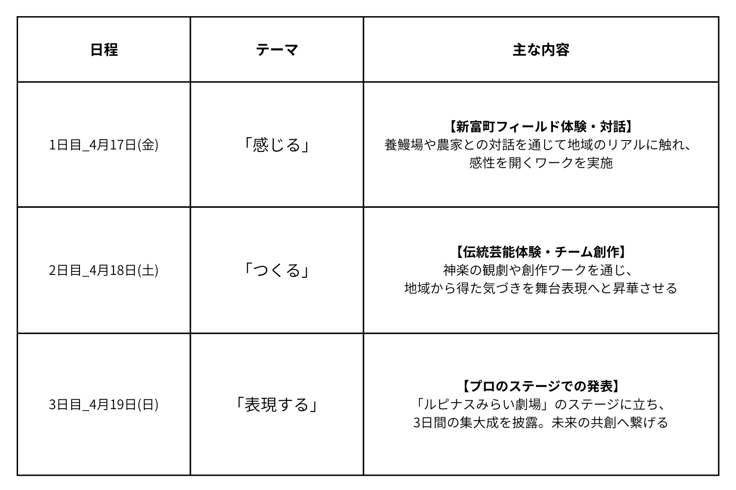 参加者は全3日間の滞在中、新富町内で様々な事業者との交流を経て、五感をフル活用して町と出会います。最終日には、こゆ財団が指定管理する新富町文化会館「ルピナスみらい劇場」で、表現へと昇華させます。