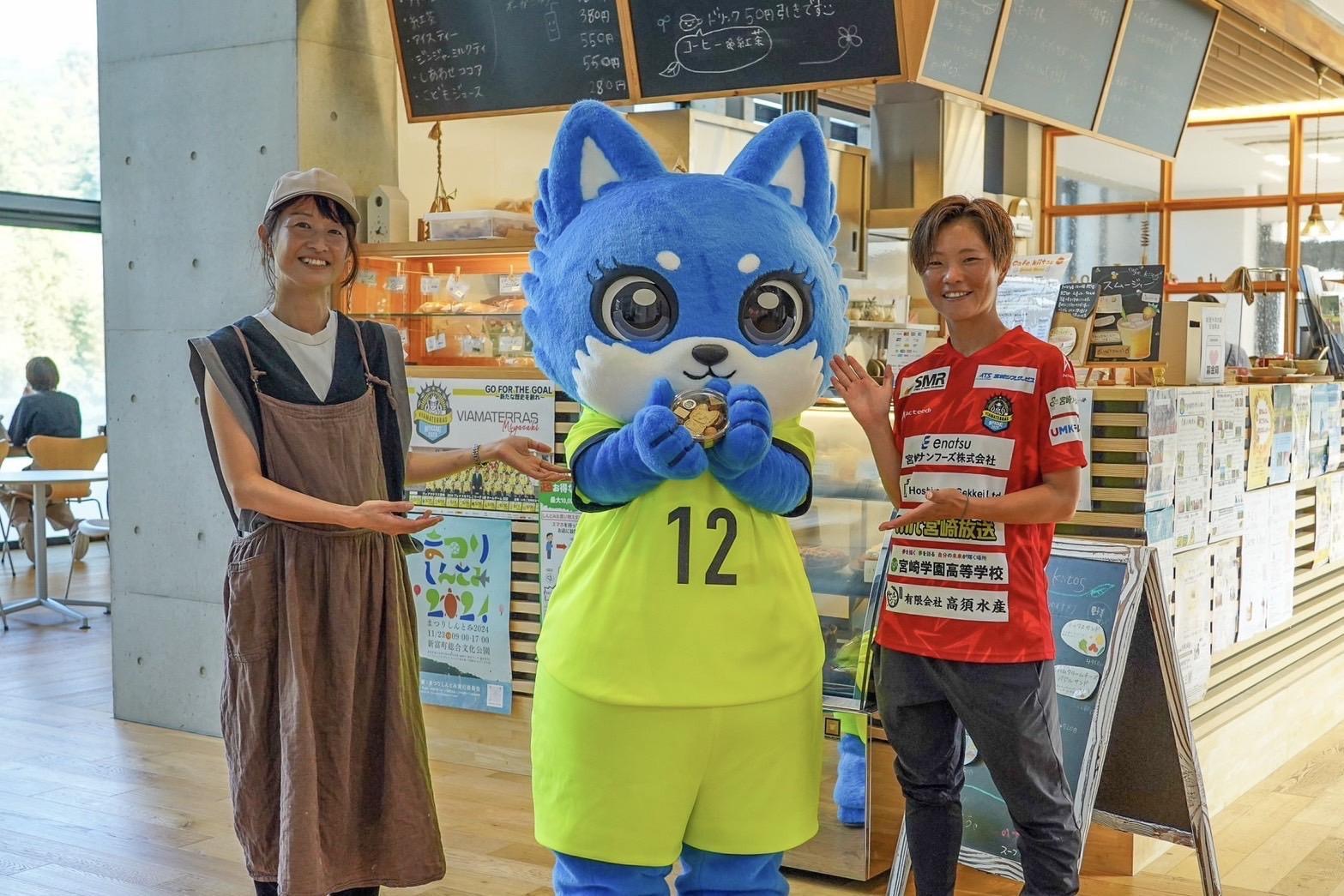 私の同期はこの方、福丸智子さん。なんと、2025年のシーズンまで女子サッカーなでしこリーグ1部の「ヴィアマテラス宮崎」でプレーしていた元サッカー選手です。キャラクター「みやざき犬」のアテンド役だった私は、実はサッカー場での仕事で同じ場所に居合わせたこともあったようです。