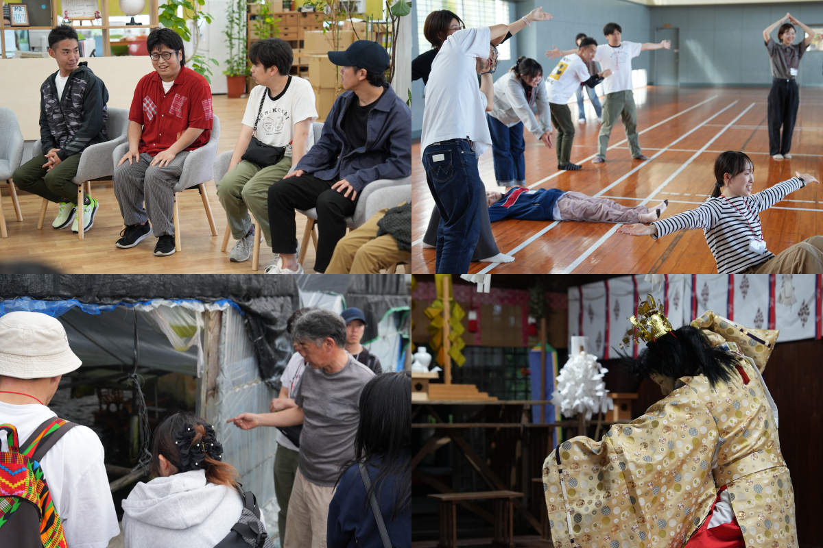 ▲左上:こゆ財団チャレンジフィールドにてオリエンテーション  右上:演劇ワークショップ